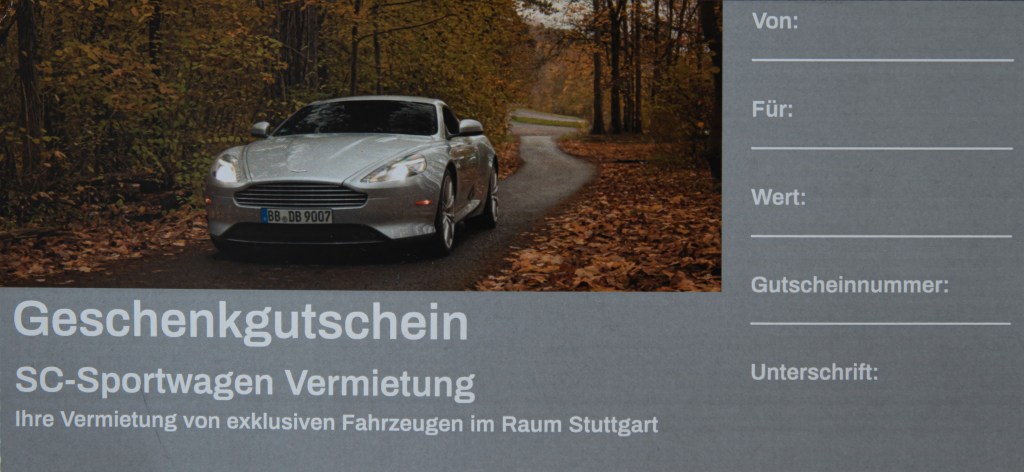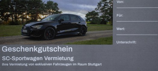 Sie sind auf der Suche nach einem Geschenk der etwas anderen Art? Dann sind Sie bei uns genau richtig. Denn mit den Gutscheinen von SC-Sportwagen können Sie Fahrspaß verschenken! Egal ob als Geburtstagsüberraschung für Ihre Liebsten, als Preis bei Ihrem Gewinnspiel oder als Belohnung für Ihre Mitarbeiter – es gibt viele Anlässe, zu denen sie mit unseren Gutscheinen Menschen eine Freude machen können, denn Erlebnisse bleiben am besten in Erinnerung. Unsere Gutscheine sind mit zwei Designs erhältlich, entweder mit unserem Audi RS3 oder dem BMW M4 GTS.